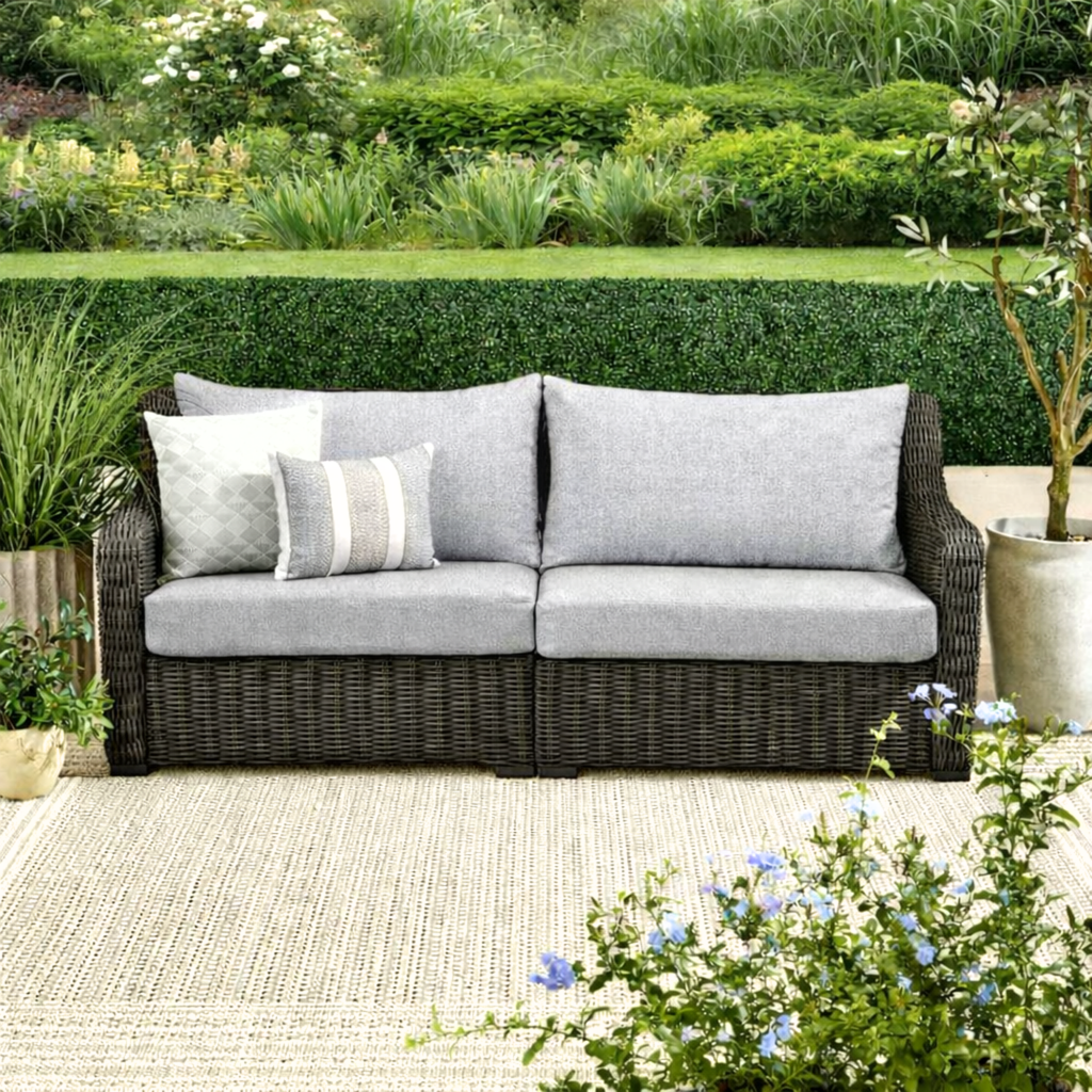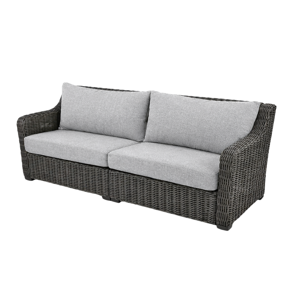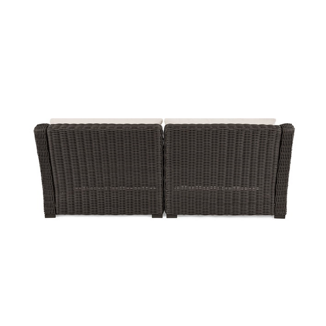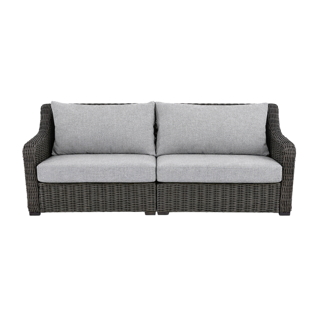 Create an inviting outdoor space with the Better Homes & Gardens Bellamy Sofa. Its dark brown weave is stylish, and the gray-colored cushions make it a comfortable addition. The sofa features attractive all-weather wicker over sturdy, e-coated, and UV-resistant solution-dyed polyester fabric cushions for long wear and rust-resistant durability. Enhance your patio, deck, porch, and other outdoor spaces with this Better Homes & Gardens Bellamy Sofa.