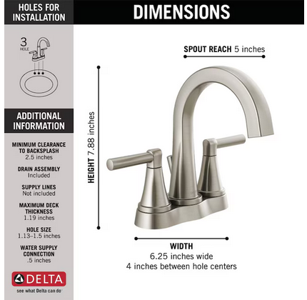 Upgrade your bathroom with the sleek and reliable Delta Faucet Becker Two-Handle Centerset Bathroom Faucet. Designed with a modern mid-arc spout and elegant SpotShield brushed nickel finish, this faucet resists fingerprints and water spots to help keep your sink area looking cleaner for longer. The dual lever handles provide smooth and precise control of hot and cold water, while the durable cartridge valve is tested for long-lasting performance.
