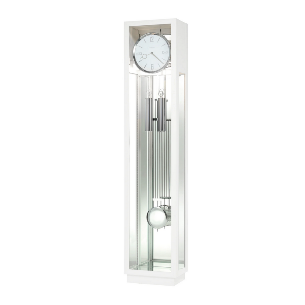 The Whitelock by Howard Miller is a premium white grandfather clock with unique design features. Custom Craftsmanship: Helping this white grandfather clock stand out is its gloss white finish on select hardwoods and veneers. Modern Design: Crafted with a modern style, this white grandfather clock features a modern, flat top with simple but elegant lines and a platform base that elevates the clock off the floor. Polished Chrome Details: A polished chrome-finished bezel surrounds the gloss white dial, which features polished chrome finished Arabic numerals, hour markers, minute track, and hands.
