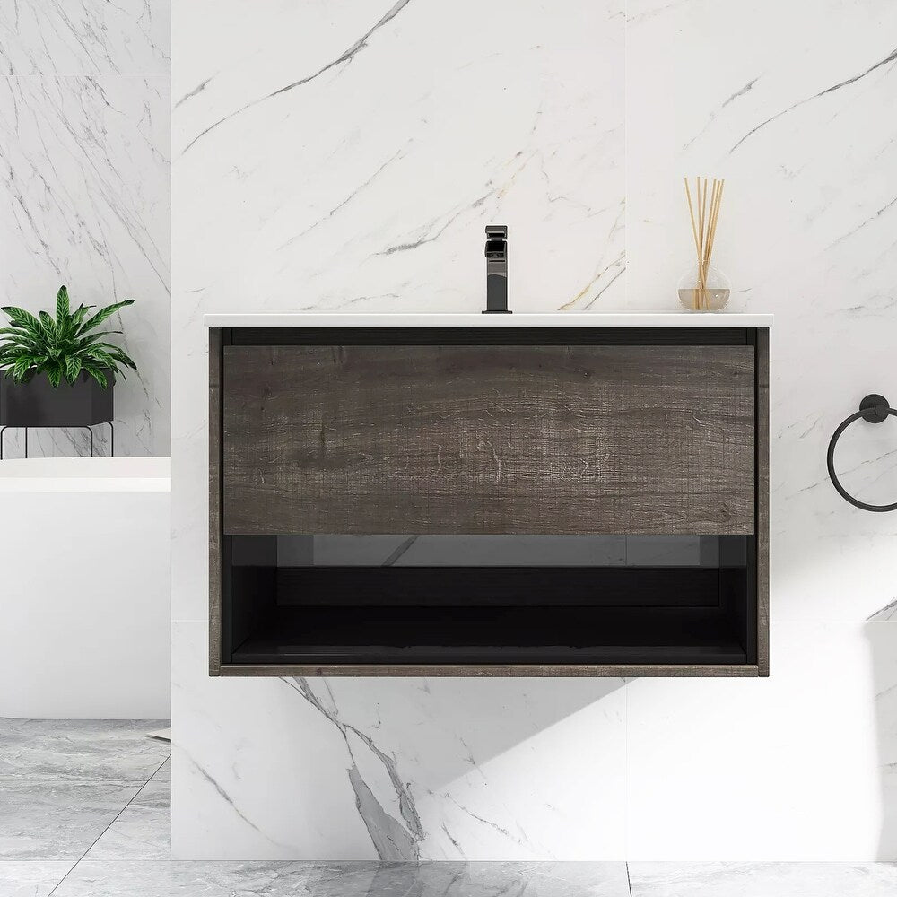 This wall-mounted vanity adds a modern look to your bathroom or powder room with its sleek silhouette and floating design. It's crafted in North America from engineered wood, and it features a stone countertop with an integrated, rectangular sink.