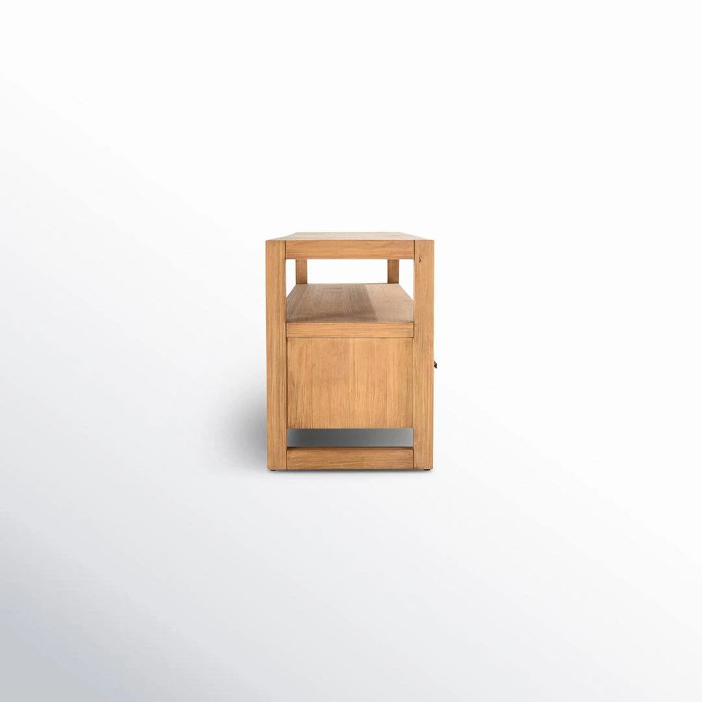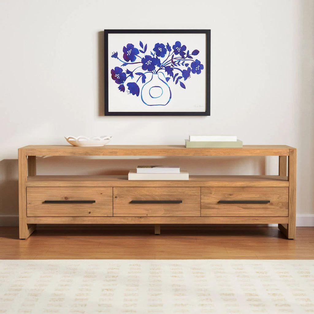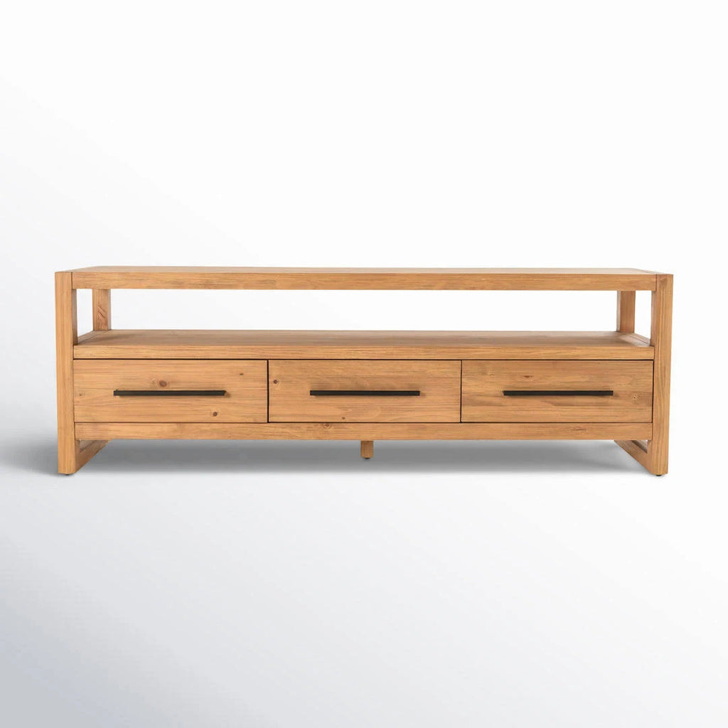 Simple and sophisticated, this streamlined TV stand combines entertainment with minimalist, Scandinavian-inspired design. Three ball-bearing glide drawers offer easy, hidden storage for smaller items, while the open cubby is perfect for media or decor. Made from wood, it has low block legs, slim iron drawer pulls, and a spacious top that supports flat screens up to 70" wide.