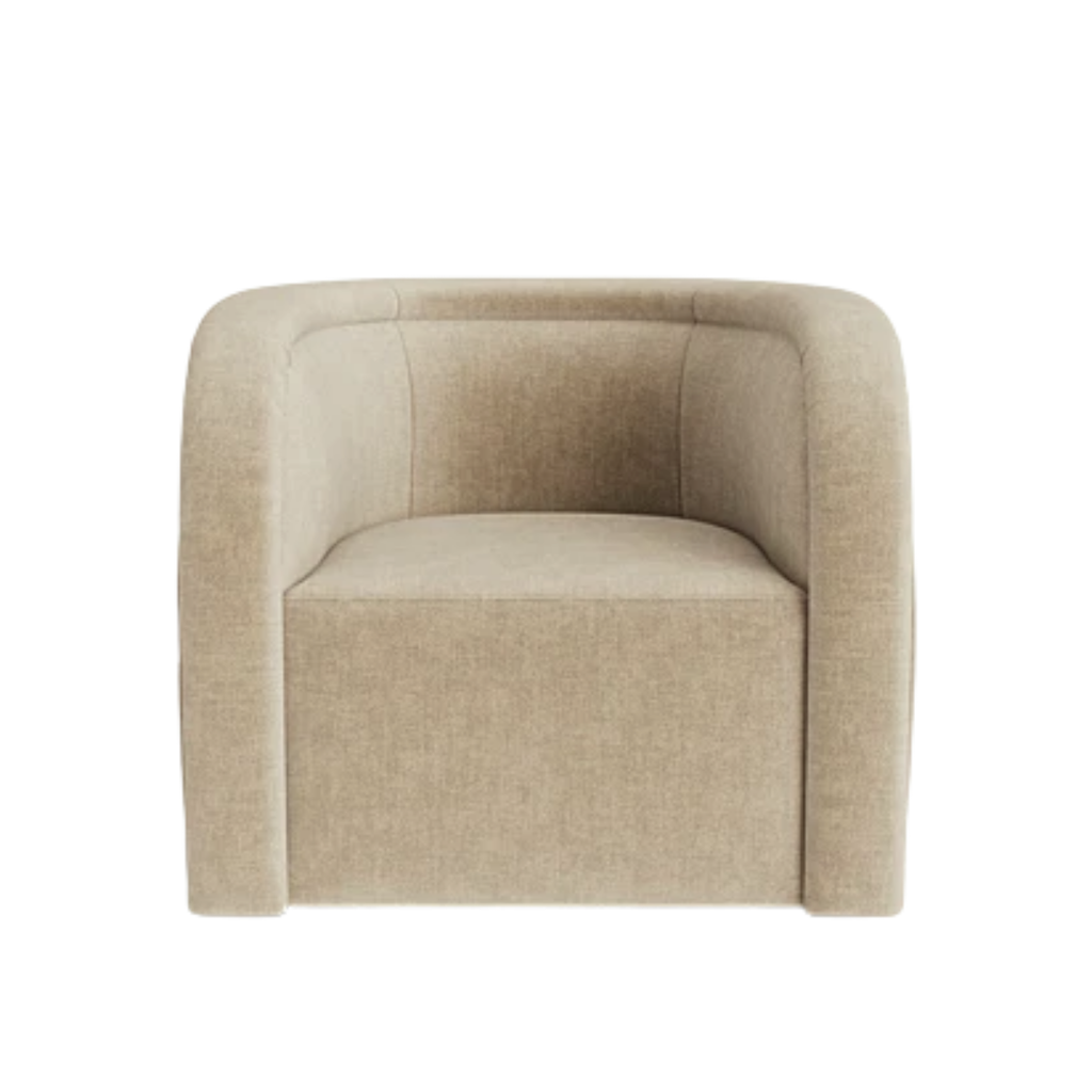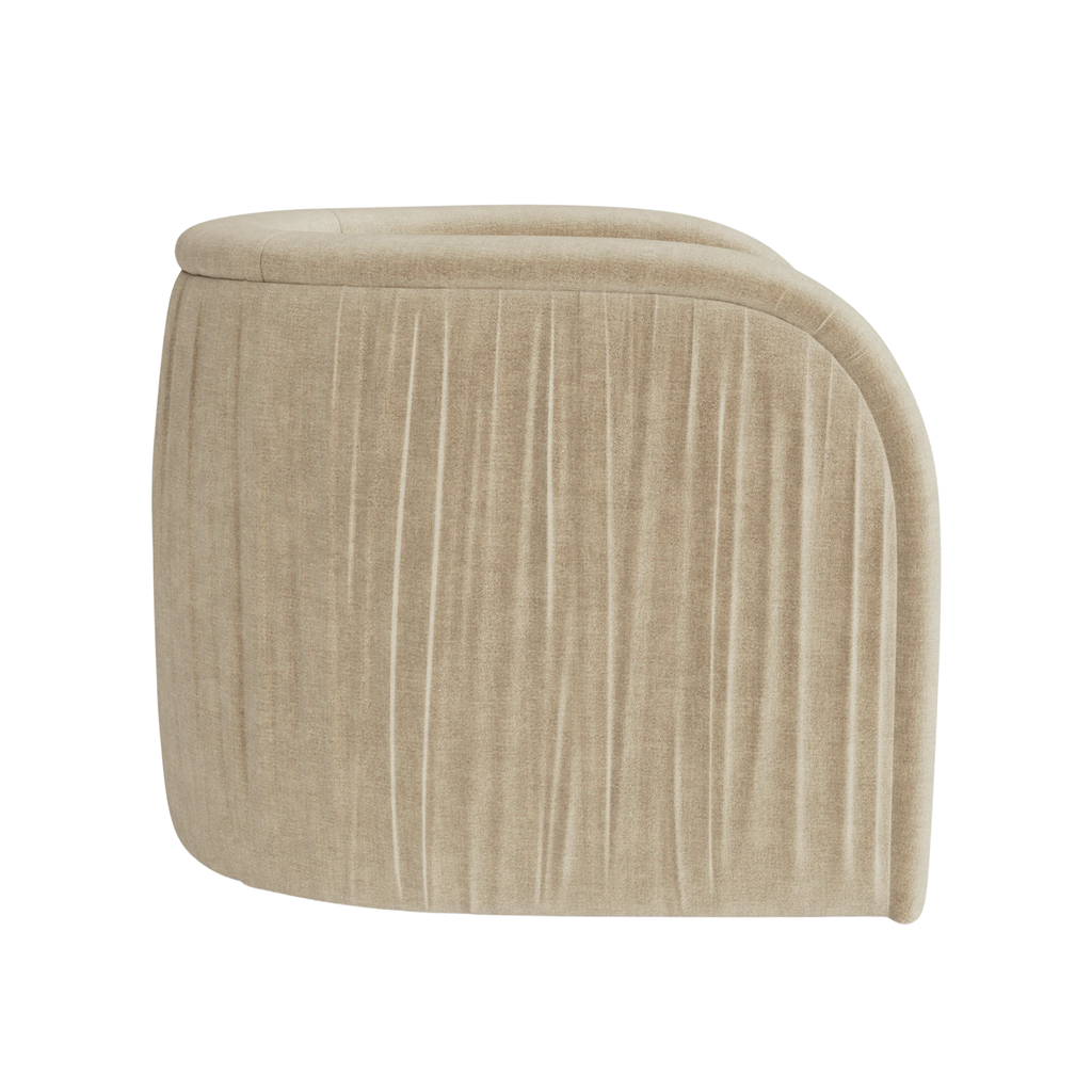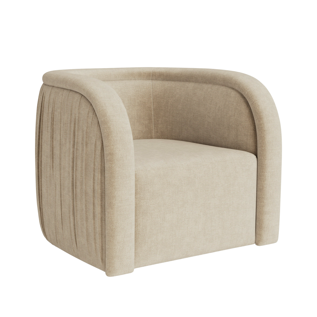 The Ricci swivel chair balances sculptural form with a grounded feel. Pleated fabric wraps the back and arms, creating a subtle texture that reads tailored yet relaxed, while the rounded silhouette invites a comfortable sit. This chair brings a soft statement and effortless movement to your living space.
