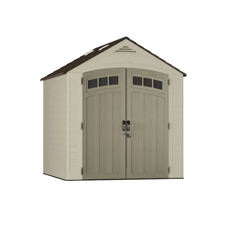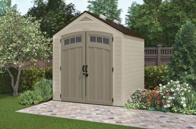 - Classic shed design with architectural details and metal-reinforced shingle-style roof panels