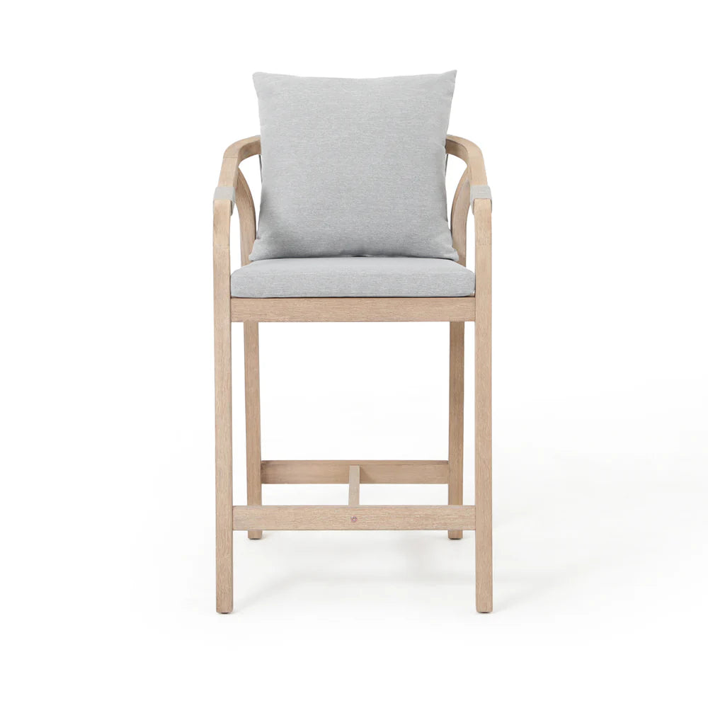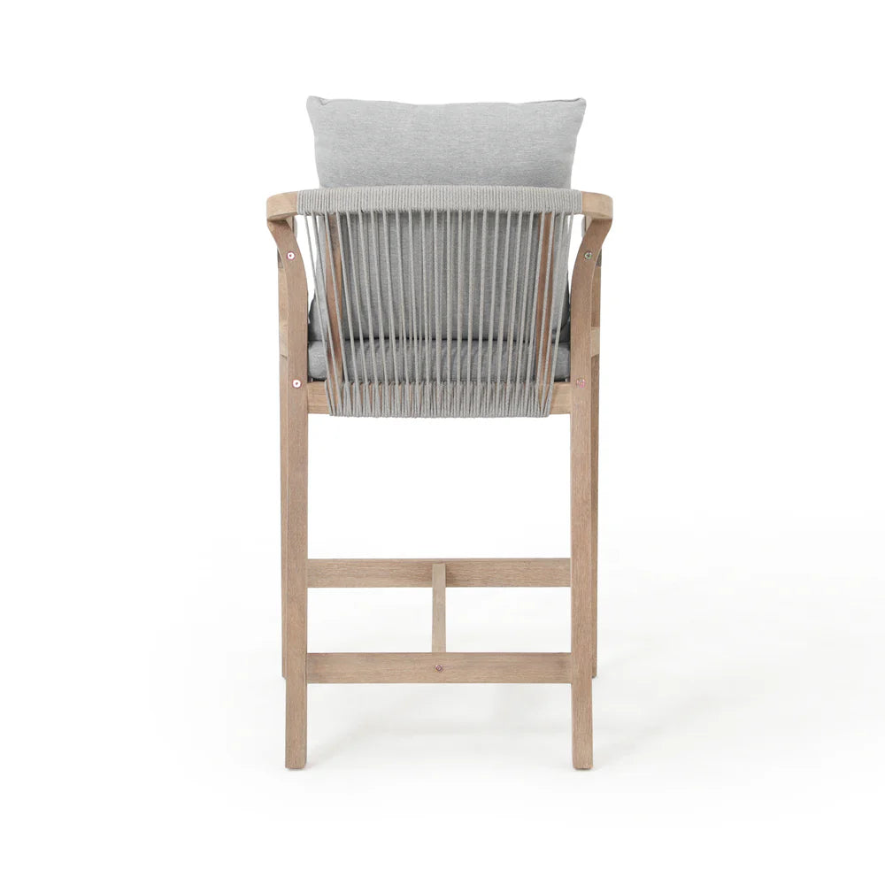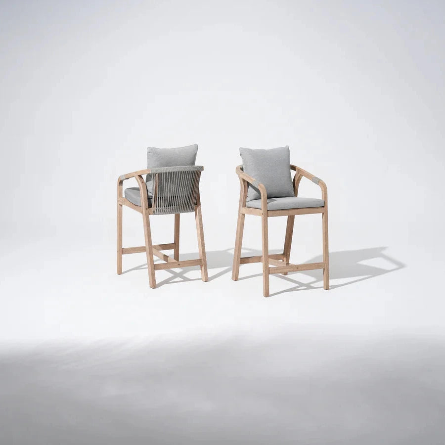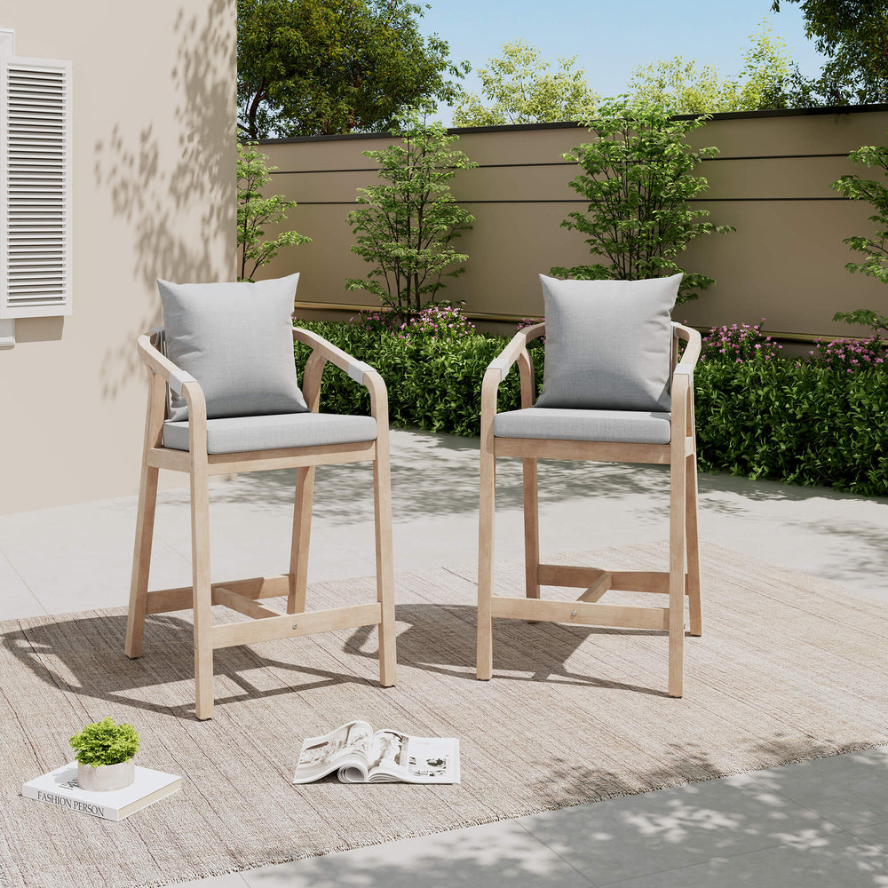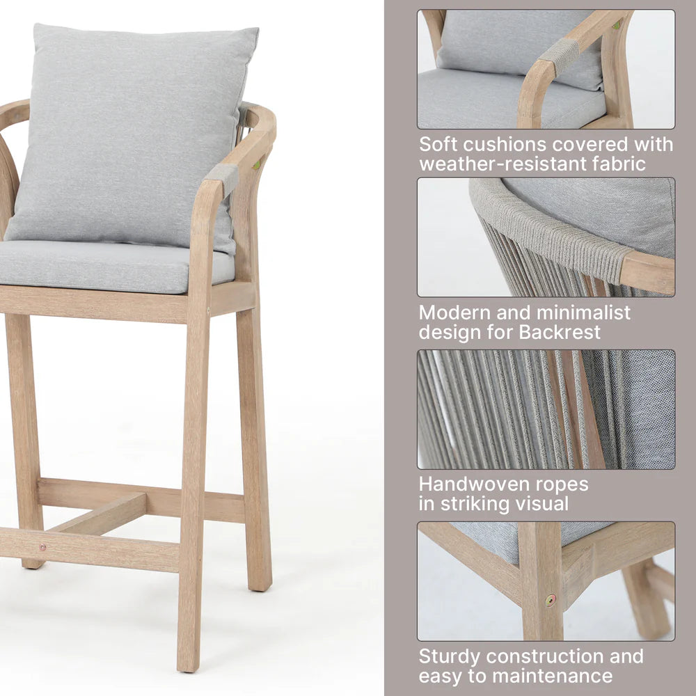 Elevate your space with the Thalea Wood Bar Stools, featuring sleek acacia wood frames and light gray performance fabric cushions that blend minimalist design with understated comfort. The clean-lined silhouette and neutral palette create versatile sophistication, while the precision craftsmanship ensures durable elegance for both indoor and outdoor settings.