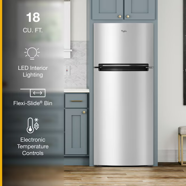 There's always a place for fresh and frozen favorites inside our Whirlpool® refrigerator. This 28" top-freezer refrigerator offers 18 cu. ft. capacity with more convenient storage options thanks to the Flexi-Slide™ bin that adjusts to make space for tall items. Bright LED interior lighting casts a more natural light on the contents of your black, white or stainless steel top-freezer refrigerator so food looks as it should. Plus, you can easily access ice by adding the Whirlpool® EZ Connect icemaker kit