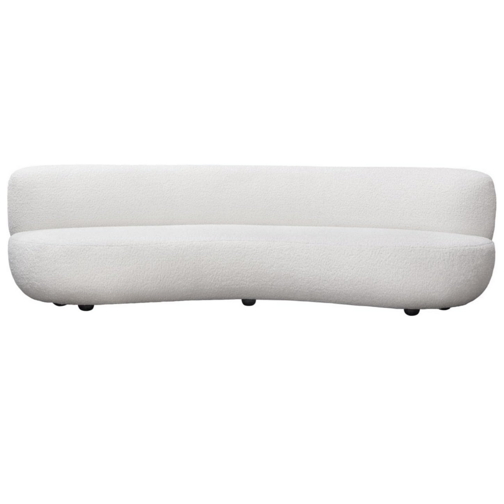 The curved bouclee sofa by Diamond Sofa oozes a sophisticated chic vibe to your home decor. With its sensuous curves, low profile seating, accented by a white faux shearling sheepskin cover, the Simone collection is sure to impress. Sofa measures 103 Inch by 47 Inch by 30 Inch. Seating Height is 16 Inches.