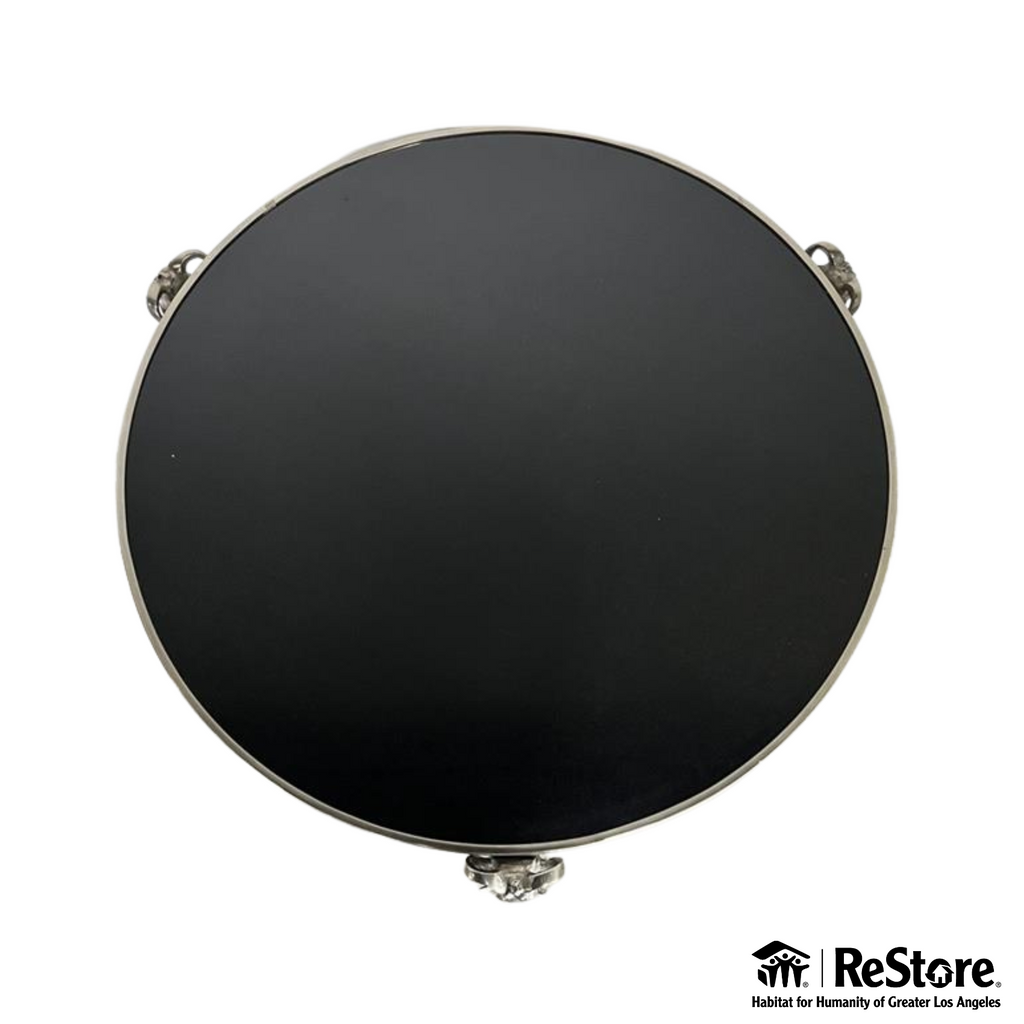 A statement piece that blends classic artistry with modern refinement. This round two-tier accent table features a lustrous polished silver frame adorned with intricately sculpted ram-head motifs on each leg. The curved legs end in clawed feet, adding a dramatic touch of neoclassical grandeur. Both tiers are fitted with glossy black glass tops that provide contrast and depth, perfect for displaying décor or serving as a functional side table. Ideal for luxurious living rooms, entryways, or offices seeking a bold yet elegant accent.