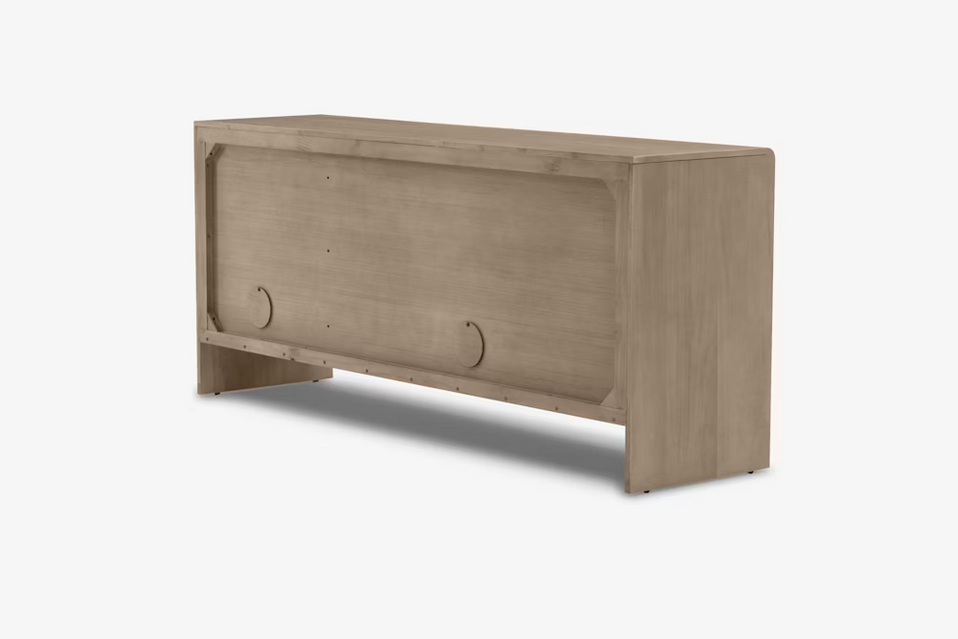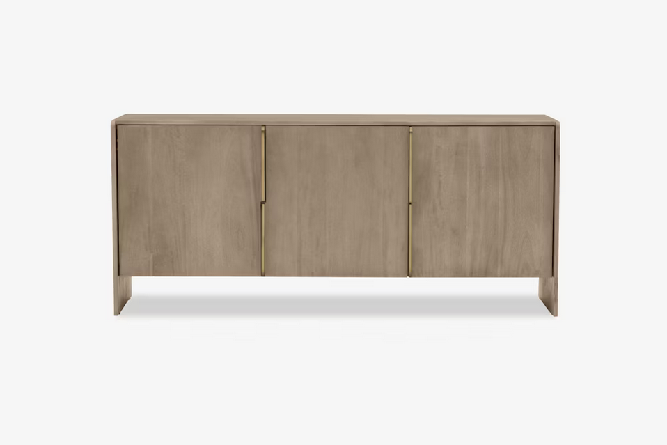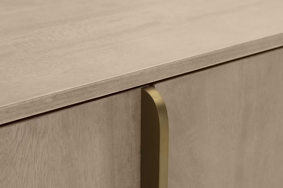 A fresh nod to Art Deco design. A light, bleach-like finish lets mango wood's natural knots and graining show through, for a feminine feel with plenty of presence. True brass hardware lends a trend-forward touch, while rear cutouts add ease of media cord management.