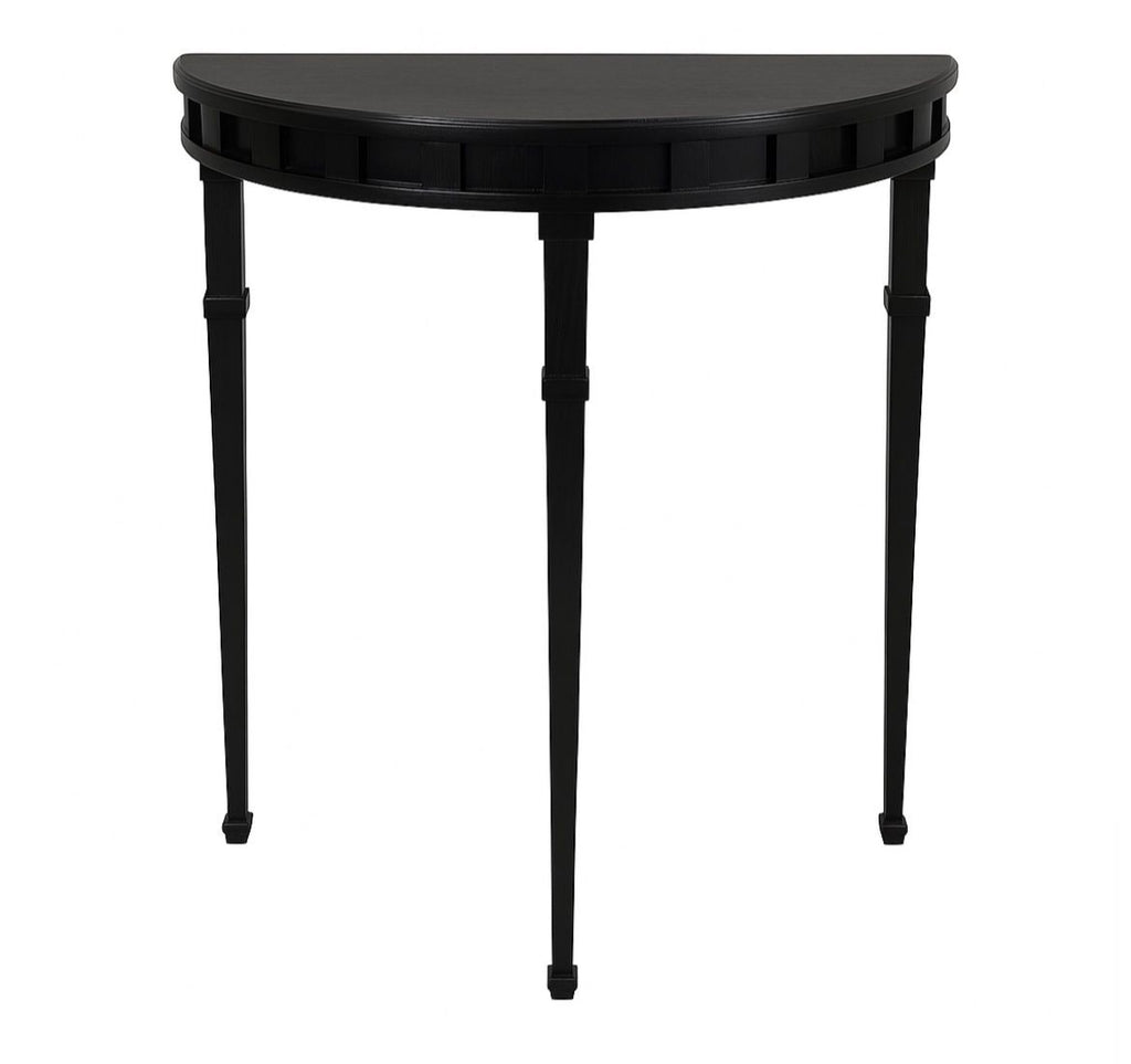 This half-moon console table features a classic demilune silhouette finished in a sleek black tone, making it a refined accent for entryways, hallways, or living spaces. The curved tabletop sits atop slender, tapered legs, creating a light and elegant profile while maintaining a strong visual presence.