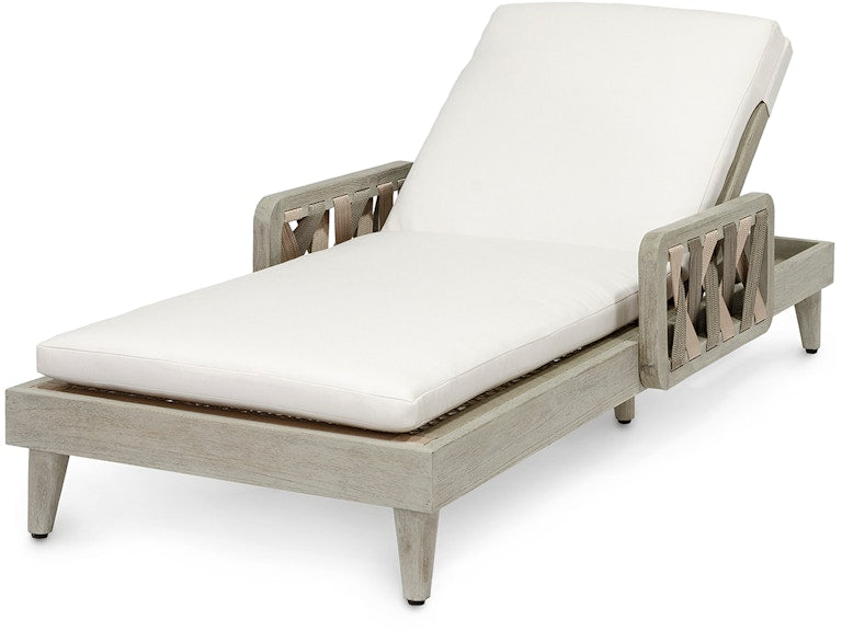 Teak wood frame and legs in a weathered grey finish with wide bands of woven synthetic rope in a taupe and grey finish with maximum UV protection. Chaise comes with a loose cushion. Coordinates with the Boca collection.