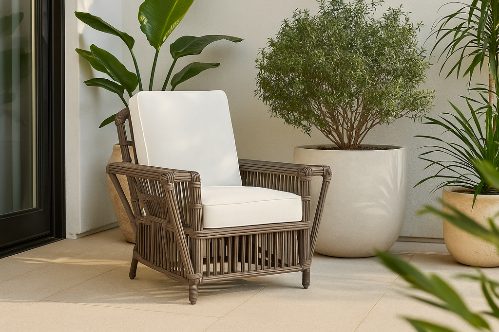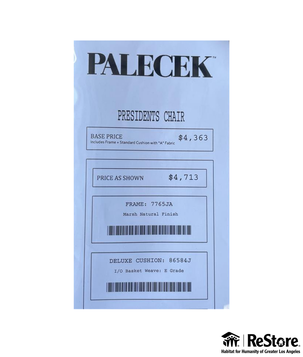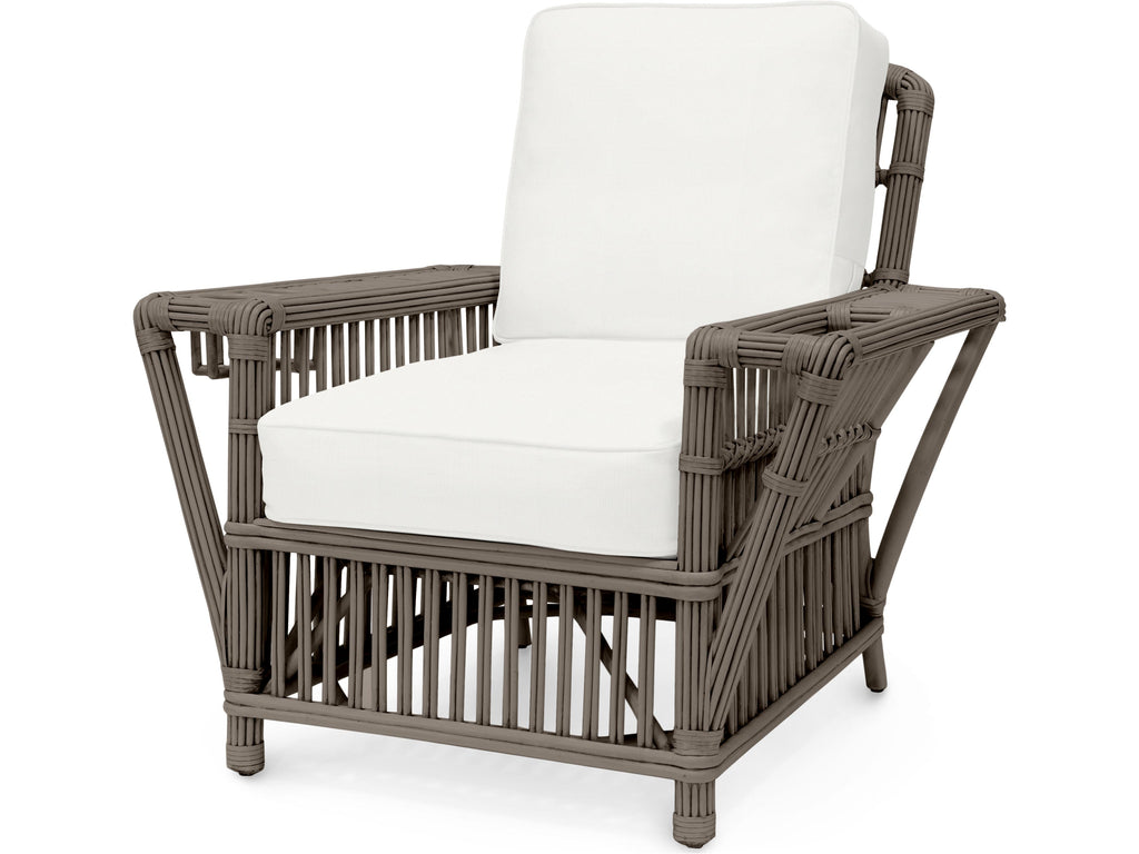 Multiple pencil pole rattan wrapped around a frame and legs accented with leather bindings and built-in magazine rack and cup holders. Chair comes with a loose seat and back cushions.