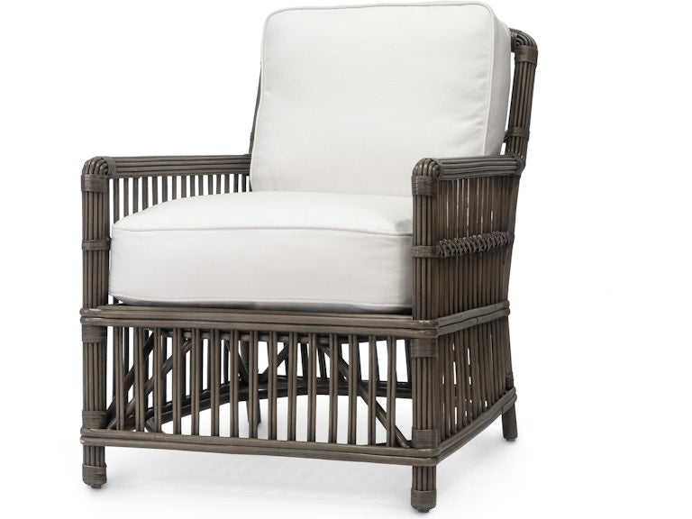 Multiple pencil pole rattan wrapped around a frame and legs accented with leather bindings. Chair comes with a loose seat and back cushions.