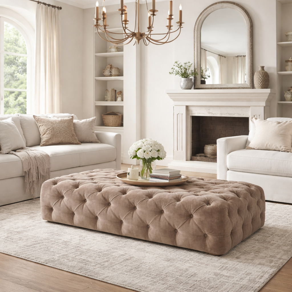 Grandly proportioned, with a low seat, plush padding and allover button tufting, our ottoman is comfort writ large. Generously padded for comfort, this piece works beautifully as a coffee-table alternative, extra seating, or a statement bench at the foot of a bed. Its low profile and clean lines make it versatile while the tufting adds a timeless, elevated look.