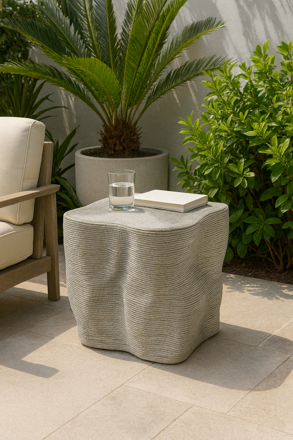 All-weather UV protected synthetic rope in a warm grey finish hand-wrapped around an organic shaped fiberglass frame. Rope is resistant to fading, breaking and stretching. Coordinates with the Caspian outdoor collection. Suitable for outdoor use.