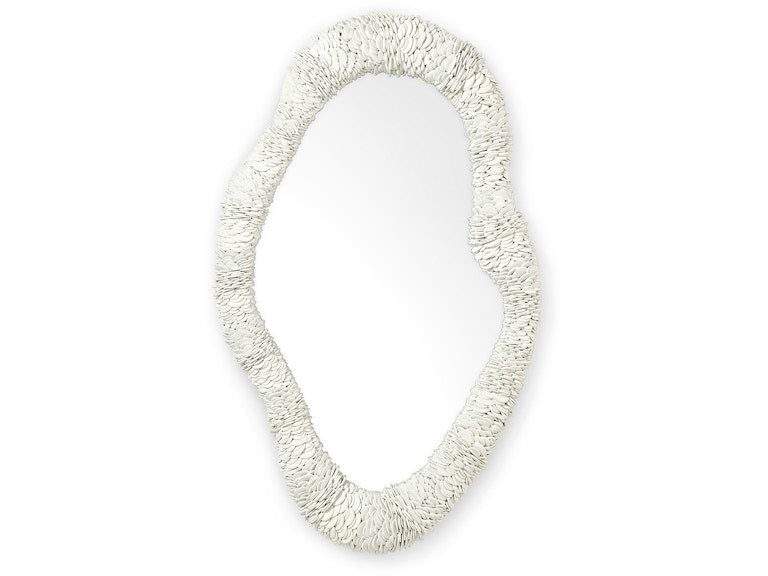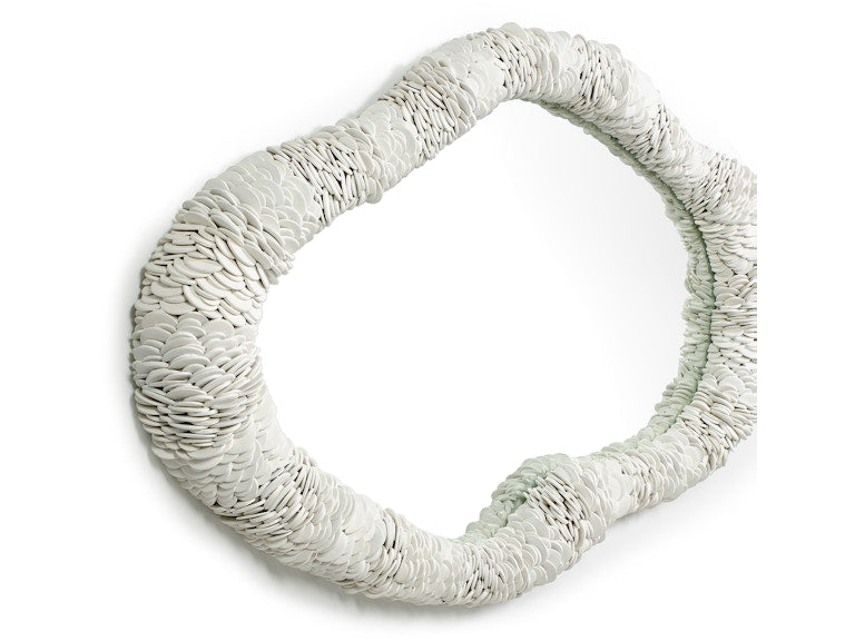 Hand-cut wood discs in a white finish placed over a fiberglass frame. Mirror comes with metal cleats for mounting both vertically and horizontally.