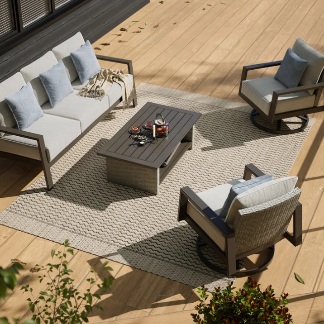 Water-resistant cushions are covered in durable Sunbrella® acrylic fabric, making them durable against the elements.