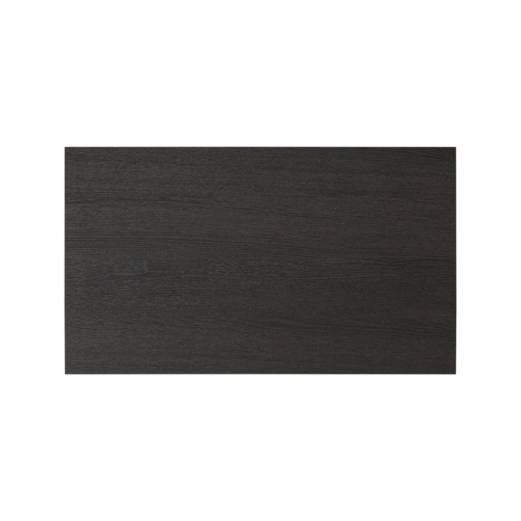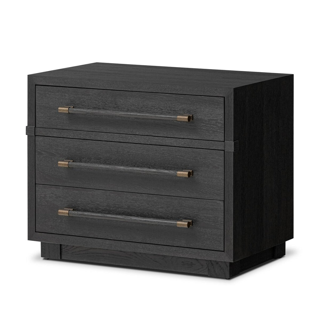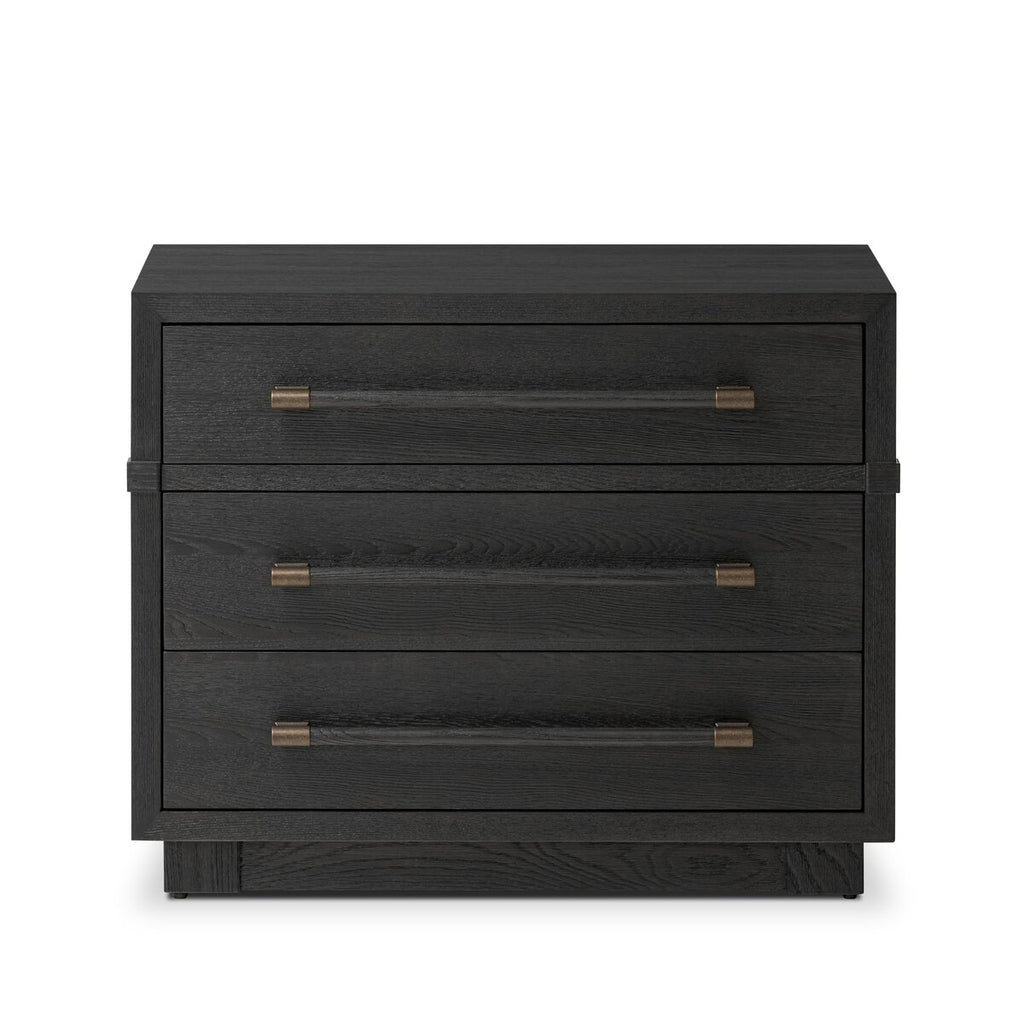 Beautifully minimalist. A three-drawer nightstand made from black-finished ash features long, linear bronzed hardware for a smooth, clean look.