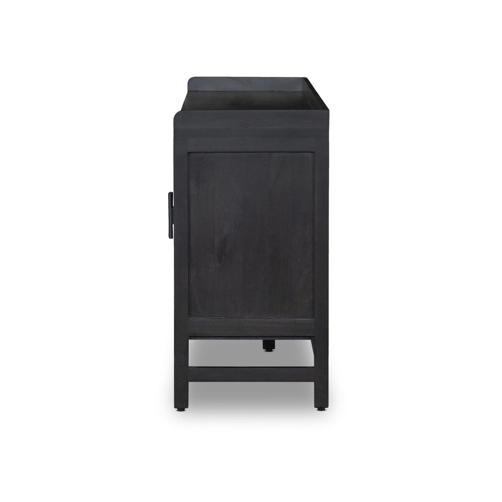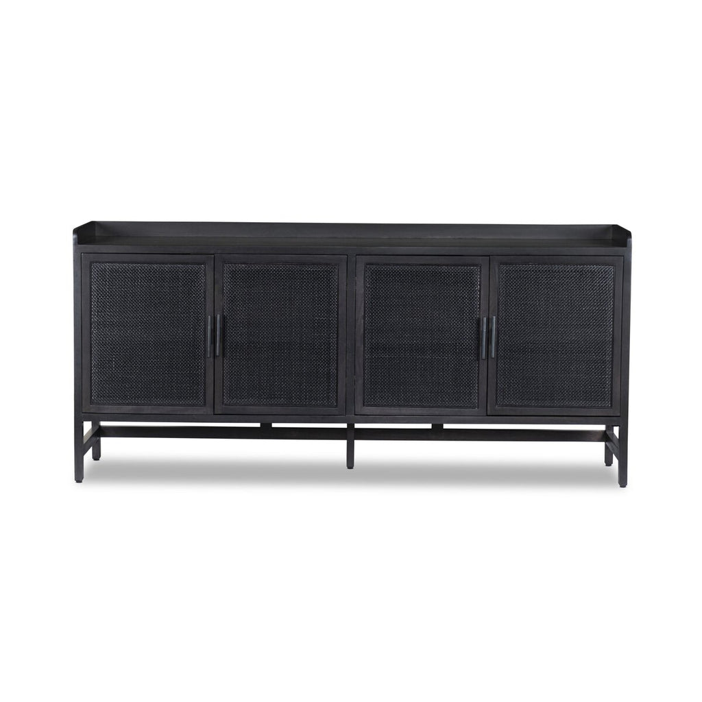 Monochromatic with a textural twist. Black-finished mango frames woven cane fronts, with black iron hardware. Inside, spacious shelving awaits storage of dinnerware and more.