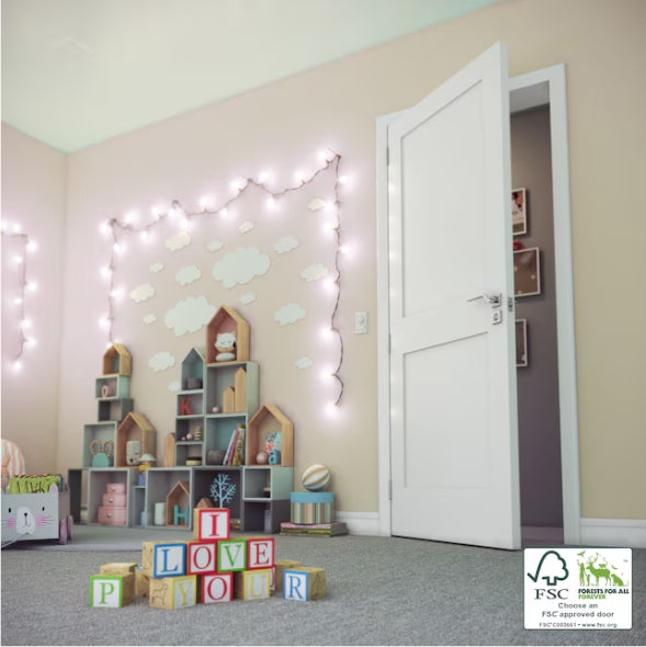 Beauty on details with added security and acoustic insulation due to the 1-3/4 inches thick solid wood door. This is the reason why the 2 panel pattern keep the classic door lines, adding to it a small but very important detail, the middle rail clean design.