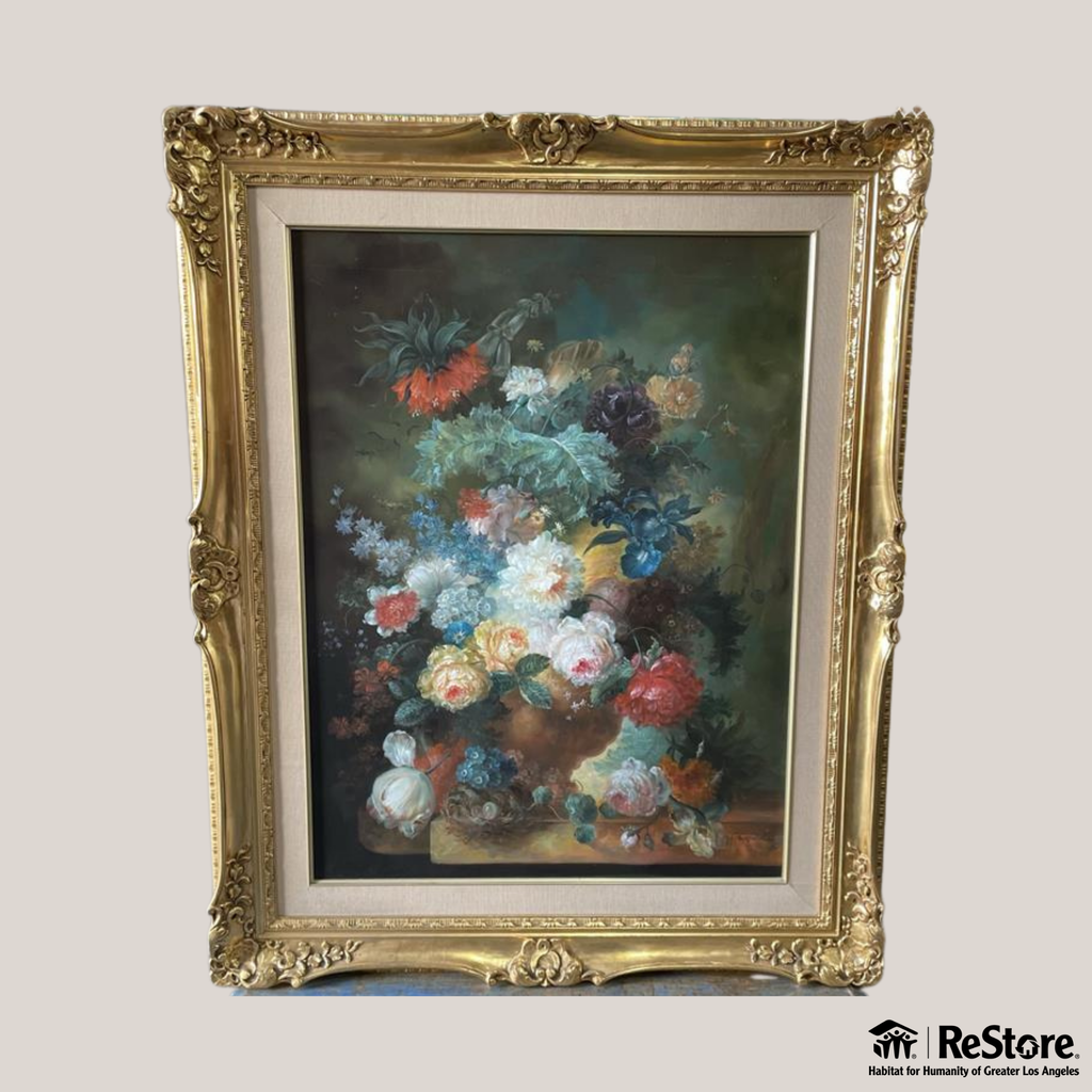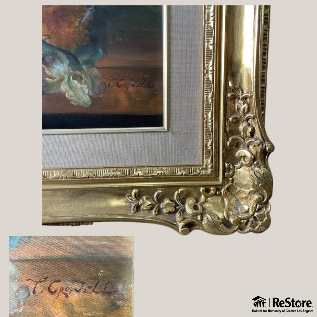 Add timeless elegance to any space with this stunning original floral still life painting, signed by artist T. Crowell. Rich in texture and color, the piece captures a lush, layered bouquet of flowers in full bloom. Presented in an elaborately carved gold frame, this artwork blends vintage sophistication with classical charm.