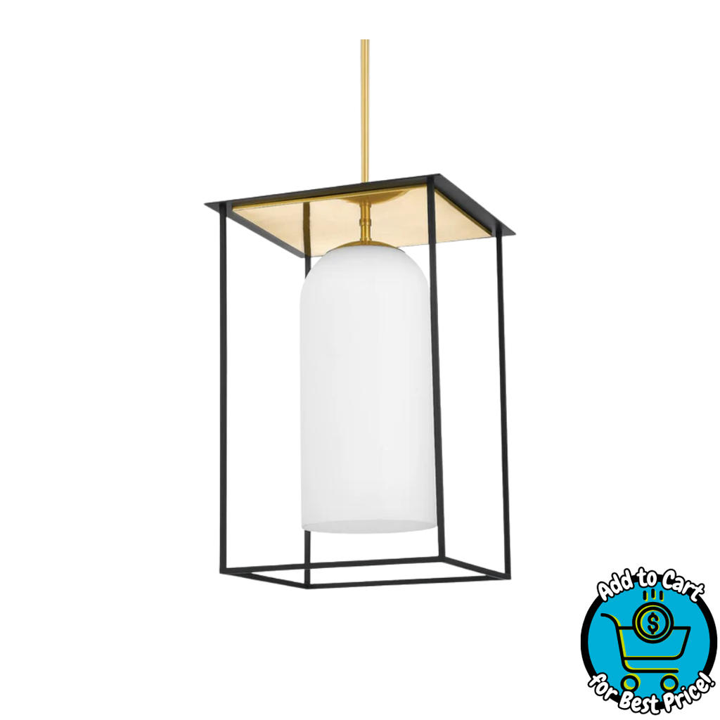 Teres reimagines lantern lighting. An opal matte cylindrical shade floats within a textured black frame, bringing together light and dark and smooth curves with angles. Light flows both through and underneath the cage and also bounces off the aged bronze or polished nickel metal above.