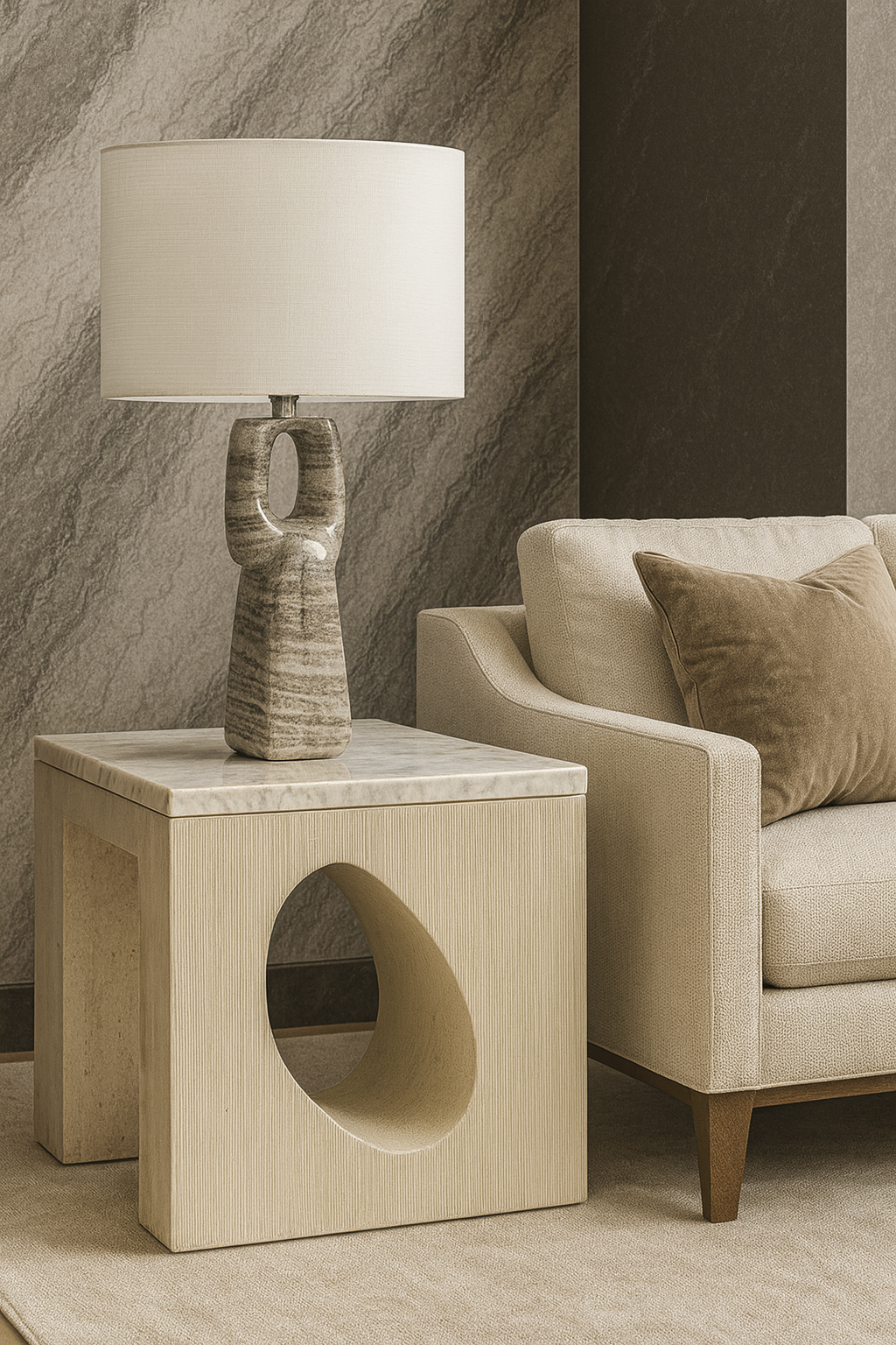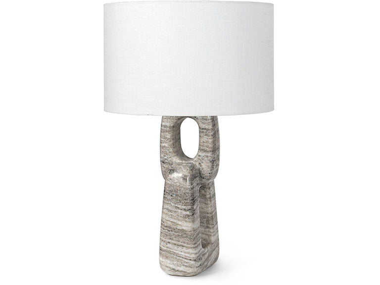 Lamp features hand-carved and polished solid marble base in natural grey and cream tones topped with a white linen drum shade. Marble is a natural material and will vary in color and grain, no two pieces will be alike.