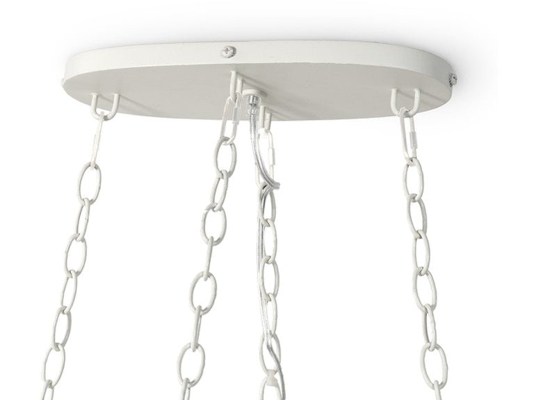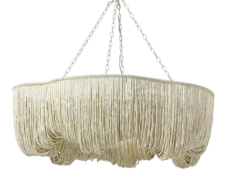 Cylinder shaped coco beads accented with tiny wood beads hand-sewn over a powder coated metal frame all in an off-white tone. Chandelier comes with a off-whte finished metal chain and canopy hanging kit. Professional installation recommended.